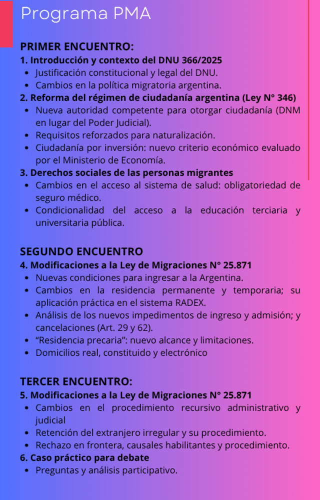 El 12, 19 y 26 de agosto se llevará a cabo el Seminario de Actualización del Régimen Migratorio y de Ciudadanía Argentina - Alcances del DNU N° 366/2025. 100% ONLINE. Ver más detalles